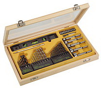 Набор подходит для работы с древесиной, металлом и бетоном. Поставляется в практичном деревянном кейсе. Состав набора: сверла по металлу 2,5/3/3,5/4/4,5/5/5,5/6/6,5/7/7,5/8 мм, сверла по дереву 4/5/6/8/10 мм, сверла по бетону 3/4/5/6/7/8/10 мм, перовые сверла 15/20/25/30/35 мм, переходник для насадок, насадки шлиц 3/5/7 мм, насадки двойной крест номер 1/2/3, насадки TORX Т10/20/25/30, уровень, металлический керн.